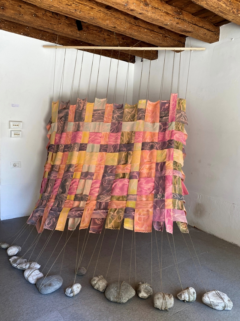 Fig.1 Sara Cecconi, Overthinking, 2025, tessuto, legno, pietra, bombolette spray acriliche, 300x200x100cm, Venezia, Castello 925.