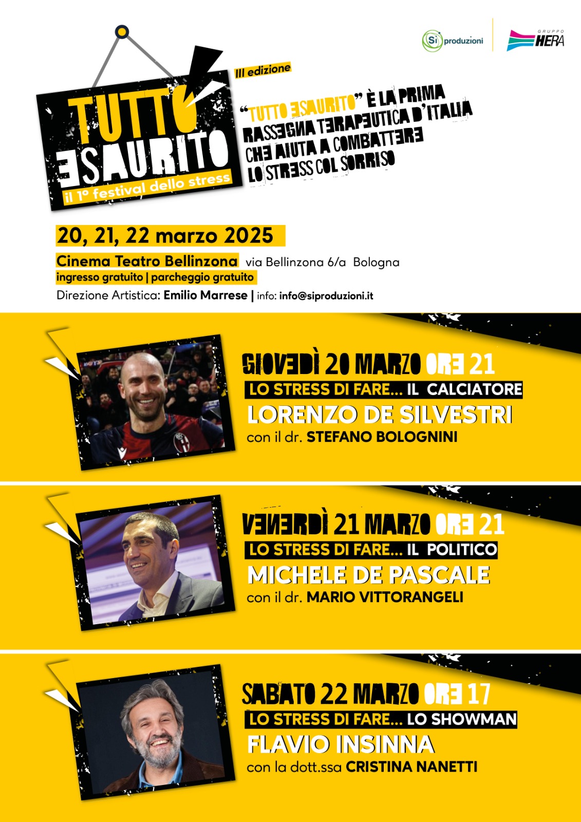 Siamo sempre tutti esauriti, stressati. Sempre stanchi, frustrati, angosciati, travolti dagli impegni, dalle aspettative, dalla competizione, costretti a vivere con ritmi frenetici spesso alienanti. TUTTO ESAURITO è la prima rassegna-festival d’Italia dedicata allo stress, che affronta con leggerezza e intelligenza un argomento universale e attualissimo. Giunto alla sua III° edizione, ogni sera, attraverso un’intervista a ospiti illustri, offre uno spazio di pensiero e divertimento per condividere questa esperienza direttamente dalla voce dei protagonisti.